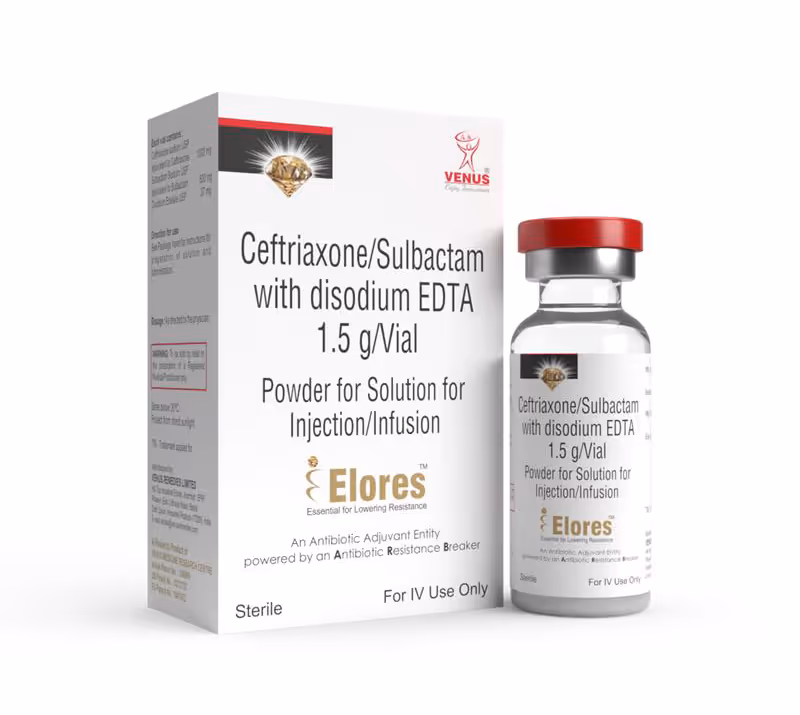 Elores, comprising Ceftriaxone, Disodium Edetate, and Sulbactam for infusion, is a synergistic antimicrobial antibiotic adjuvant entity with marked in vitro antibacterial activity against a broad spectrum of ESBL-producing microorganisms
